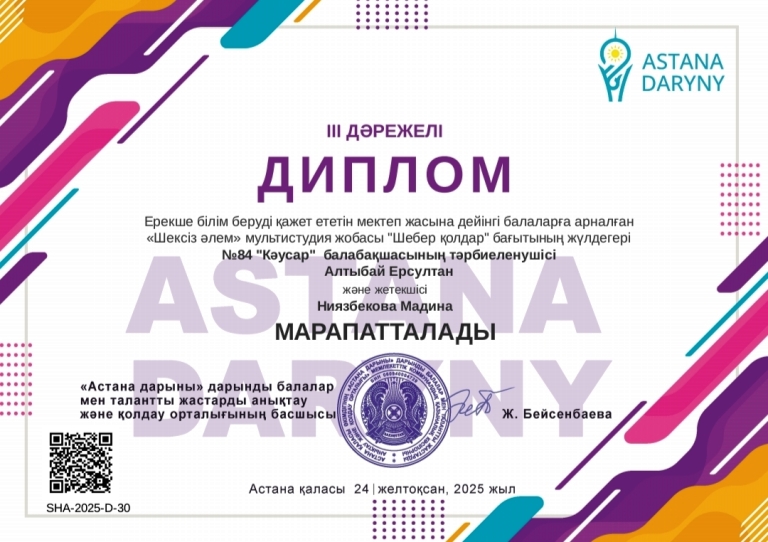 Ерекше білім беруді қажет ететін мектеп жасына дейінгі балаларға арналған «Шексіз әлем» мультистудия жобасының «Шебер қолдар» бағыты бойынша жүлдегері атанып, шығармашылық қабілеті мен еңбекқорлығын жоғары деңгейде танытқаны үшін дипломмен марапатталды.
